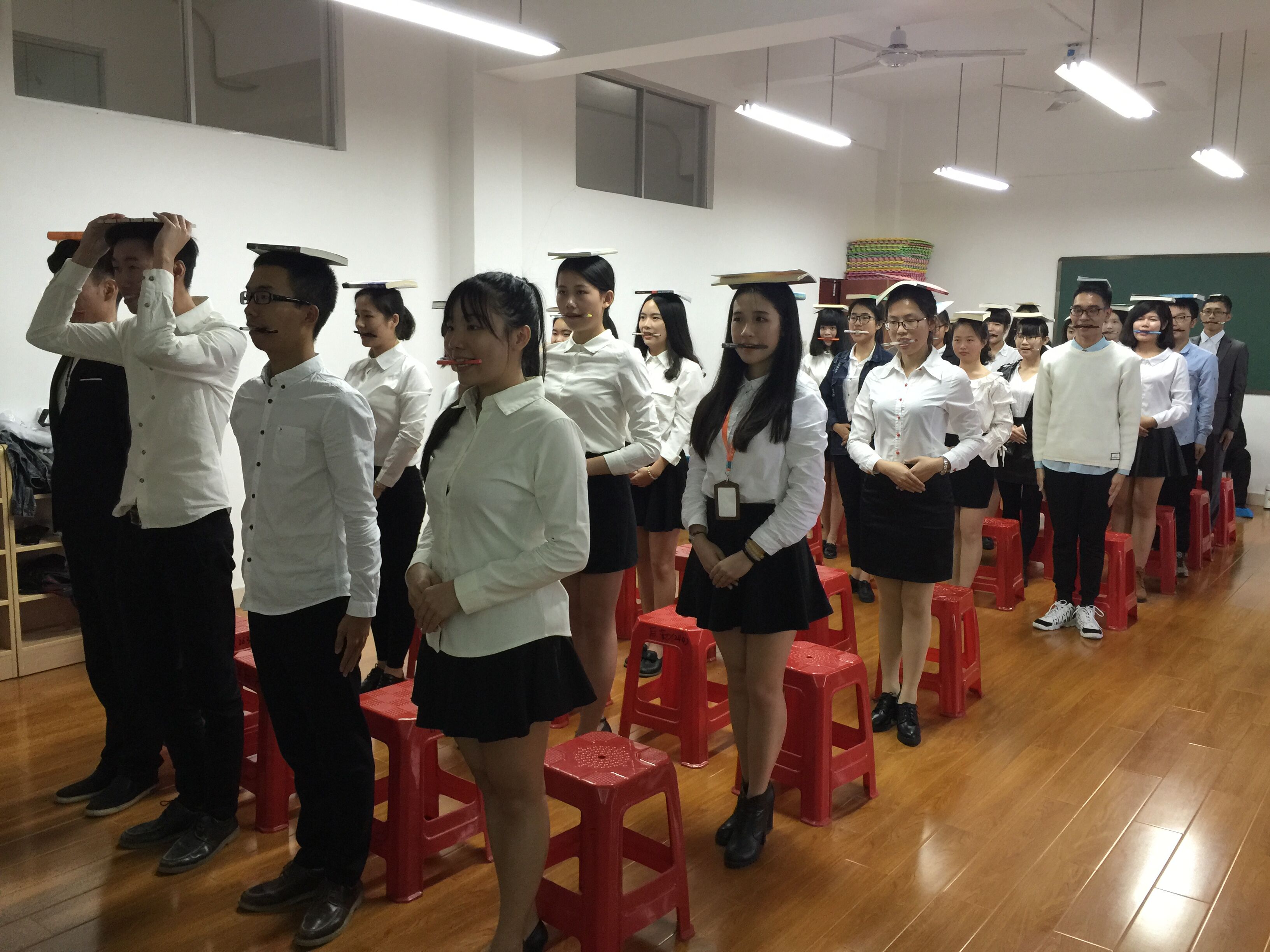 三、举止礼仪练习和终极PK。秦秀丽老师组织全体成员进行微笑、坐姿、站姿的练习。学员们各自头顶一本书(站姿笔直)、嘴咬一支笔(微笑露齿),完成了10分钟的练习。女学员们也通过练习掌握了五种坐姿。最后,全体成员分为4个小组,围绕队形、站姿、坐姿、鞠躬四个礼仪知识进行最终PK,由黄晓滨老师、企业方班主任和校方班主任进行打分,评出今日礼仪最佳团队,授以小礼物。