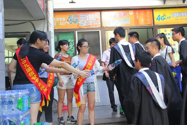 上午,在康美校区员工活动中心入口处,前来参加毕业典礼的2015届毕业生都能免费领取一瓶由2009届信息管理与信息系统专业员工送出的矿泉水。一瓶“爱心水”为炎热的天气送来一丝清凉,为2015届毕业生送去美好祝愿,活动共发放2300多瓶矿泉水,表达了员工们热爱母校,心系母校。