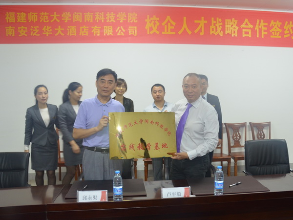 6月18日,公司与南安泛华大酒店共建教学实践基地签约授牌仪式在南安泛华大酒店举行。经理邱永渠和南安泛华大酒店总经理卢平毅签订教学实践基地共建协议并共同为基地授牌。