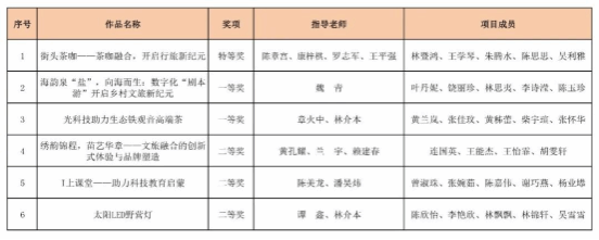 经过激烈角逐,最终评选出特等奖1项、一等奖2项、二等奖3项。其中,《街头茶咖——茶咖融合,开启行旅新纪元》(项目成员:林暨鸿、王学琴、朱腾水、陈思思、吴利雅,指导老师:陈章宫、康梓棋、罗志军、王平强)获得校赛特等奖。