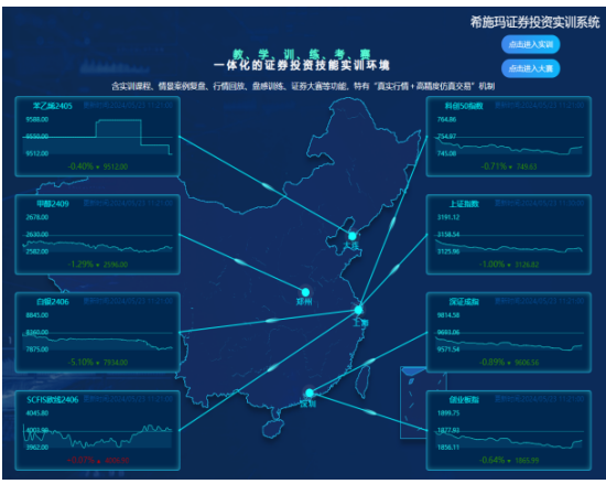 证券投资实训室主要服务于公司证券投资类课程和各类证券投资模拟竞赛备赛。本实训室依托希施玛公司开发的“证券投资实训系列”,为相关专业及课程的师生提供教、学、训、练、考、赛全方位一体化平台。在实训过程中,以真实行情、真实交易及结算机制为基础,将丰富的实训教学资源、典型案例分析与多样化的分析及训练工具、全面的交易品种及业务相结合,提供了高度仿真的模拟投资环境与证券投资技能实训,同时提供行情回放演练功能满足非交易时段的实训需求,为培养掌握证券投资理论与技能的应用型人才提供了有力支持。